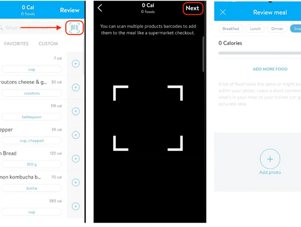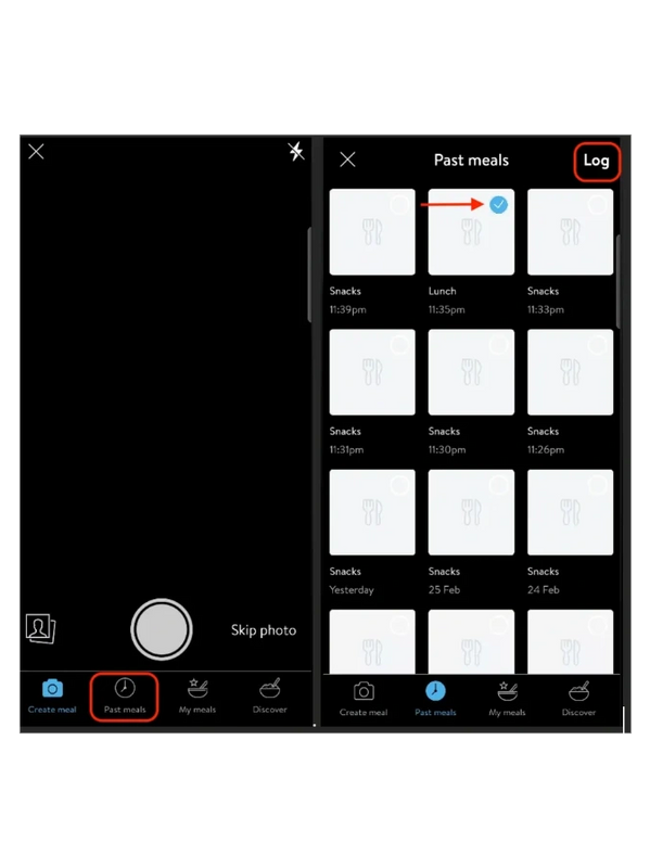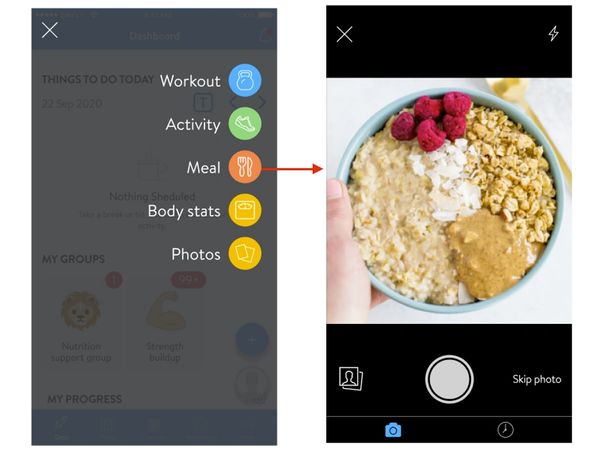 2. Right away, after selecting to track a “Meal,” the you will be able to snap a photo of your meal, upload a photo from their gallery, or skip the photo and go straight to logging the meal.