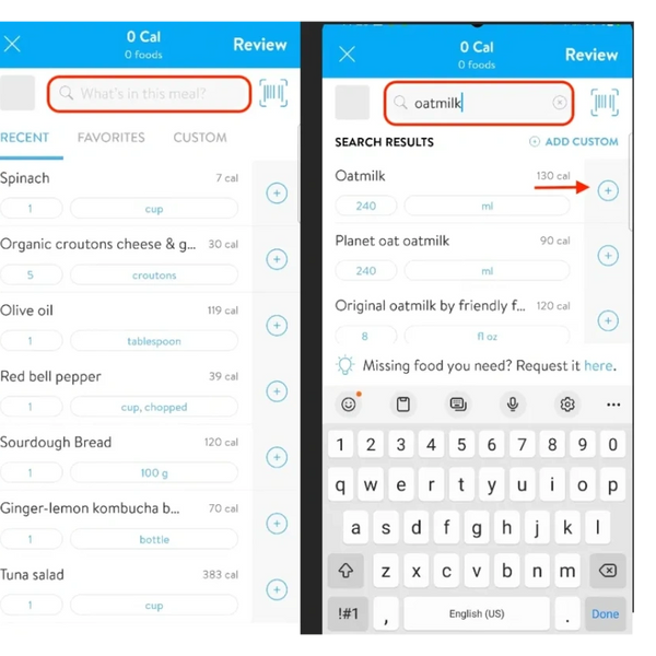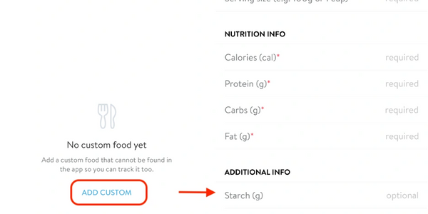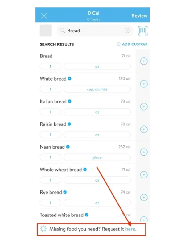 If a food does not exist when you search for the food, you can go to the CUSTOM tab and add a custom food manually.