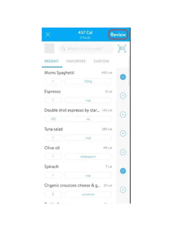 Any recently selected foods will be stored in the RECENT tab. And by tapping on the name of the food, you will be able to view all of the details of the food. This includes the serving information, calories, macros, and micronutrients.